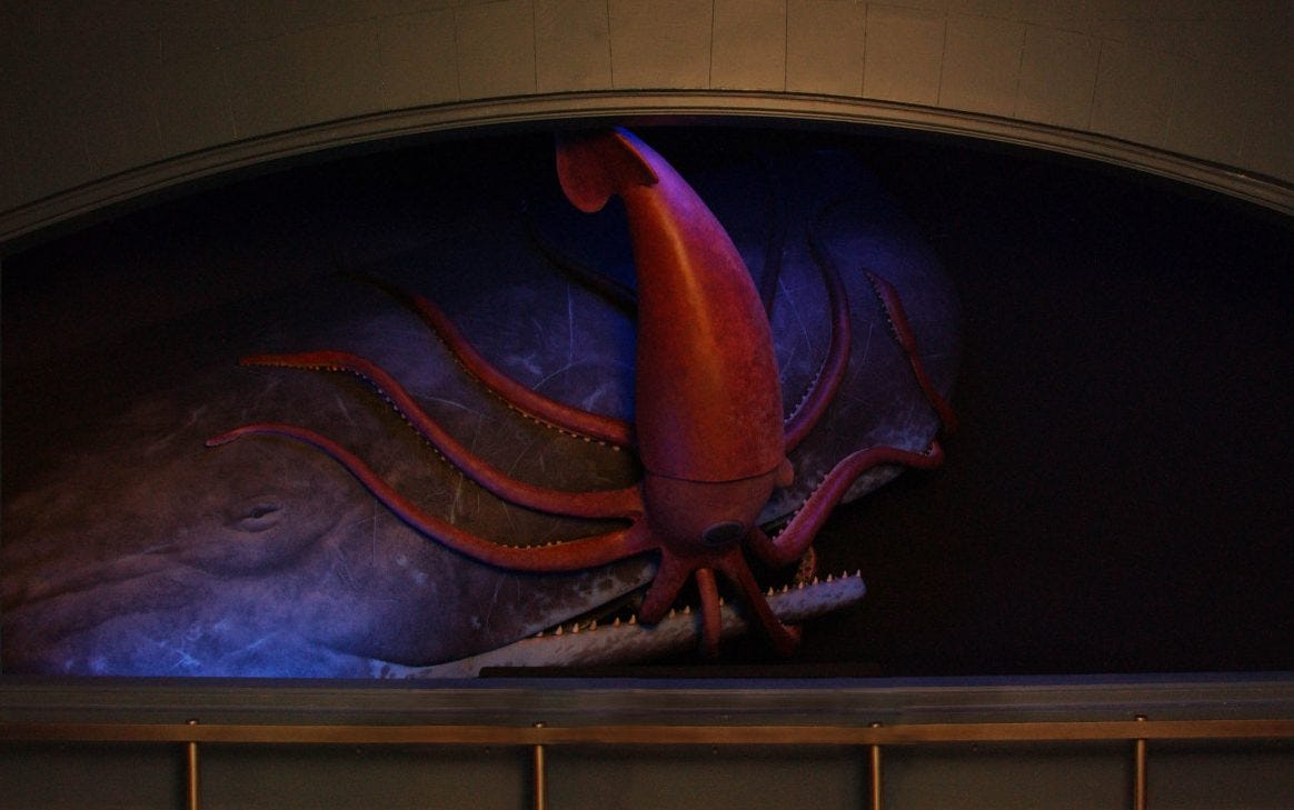 I found another sanctuary in the Hall of Ocean Life. To get there required navigating the hall of biodiversity, which featured a life-size dodo bird sculpture and a lush rainforest model. Eventually, the green of feigned African tulip trees gave way to a rippling blue light, signaling that we were crossing over to another world. Descending two flights of stairs brought us to the main level, where diorama sculptures of marine animals lined the walls. Behind one glass pane was a vaguely depressed manatee, suspended in midair. At another window, a pod of dolphins competed for the same fish. My favorite of them all depicted a sperm whale and a giant squid locked in vicious combat, 6500 feet under the sea. It was an epic battle, fought entirely in darkness. Even as the whale snatched his opponent in his jaw, the squid struggled relentlessly to break free, splaying her tentacles against the whale’s pained face. Something about the darkness of the scene attracted me. Even more intriguing was the obscurity of the two species; the first confirmed recording of a giant squid in the wild was as recent as 2005. The diorama naturally became my favorite corner of the entire museum. My father and sister both understood, in the way family members do, that the squid and the whale belonged to me. On certain occasions, they left me alone there for long stretches of time. I was content to stand before my sea monsters, imagining myself at the ocean floor. Besides, I had another guardian watching over me: a 94-foot blue whale hung from the ceiling, surveying her human visitors below. Next came a cafeteria meal of dinosaur-shaped chicken nuggets, grape juice, and black-and-white cookies.